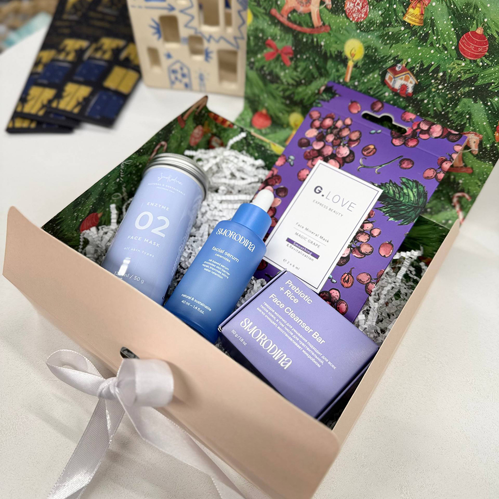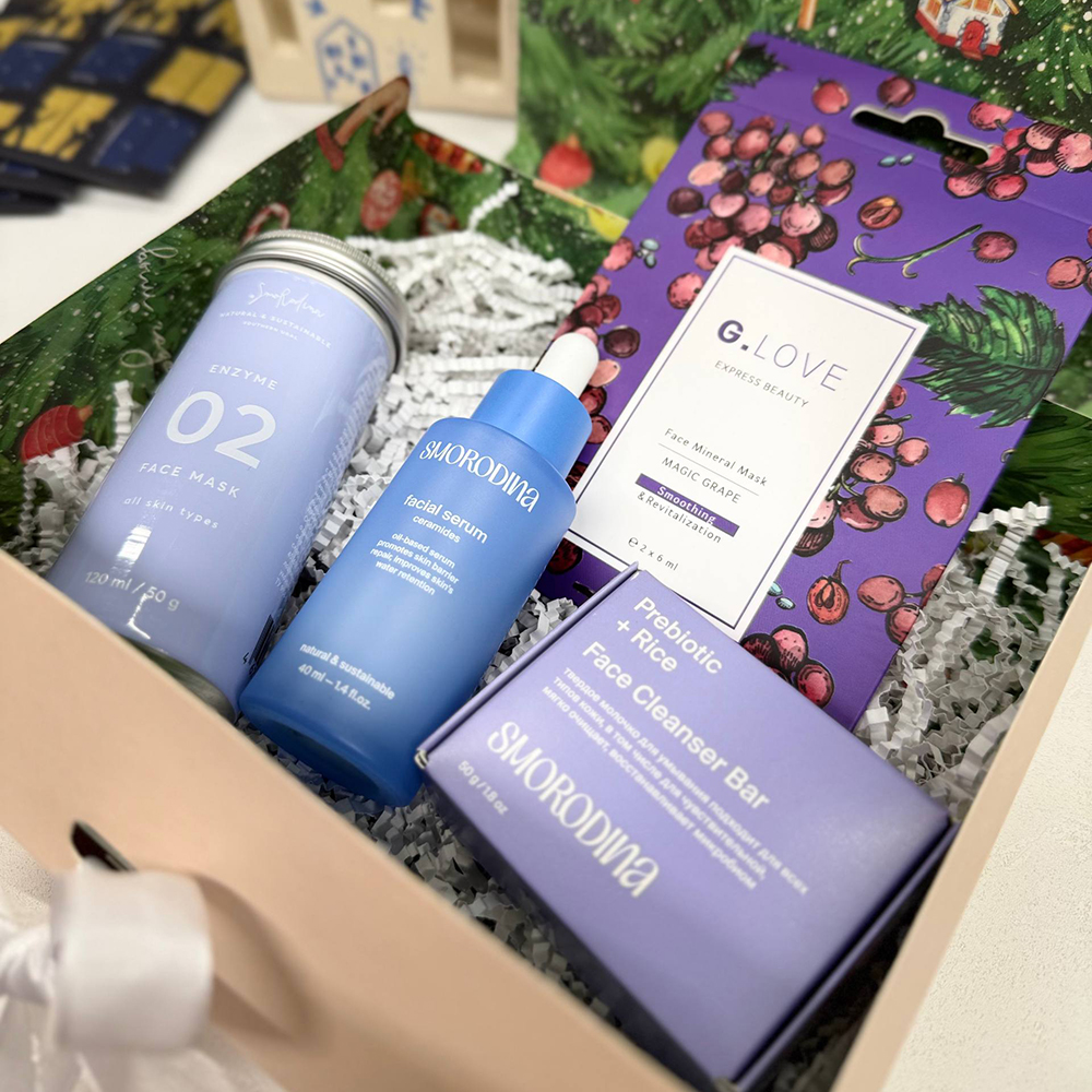 В набор входит: Энзимная маска для всех типов кожи 02 SmoRodina; Увлажняющая сыворотка для лица с церамидами «Ceramides» SmoRodina Твердое молочко для очищения лица с пудрой риса и пребиотиками SmoRodina Набор масок для лица с минералами "Гладкость и ревитализация" в конверте MAGIC GRAPE G.Love; Подарочная упаковка; Наша фирменная открытка.